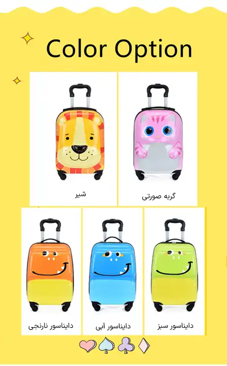 دارای چهار چرخ ۳۶۰ درجه ,دارای دسته ترولی جمع شو ,سایز 20 چمدانی ,طرح فانتزی |