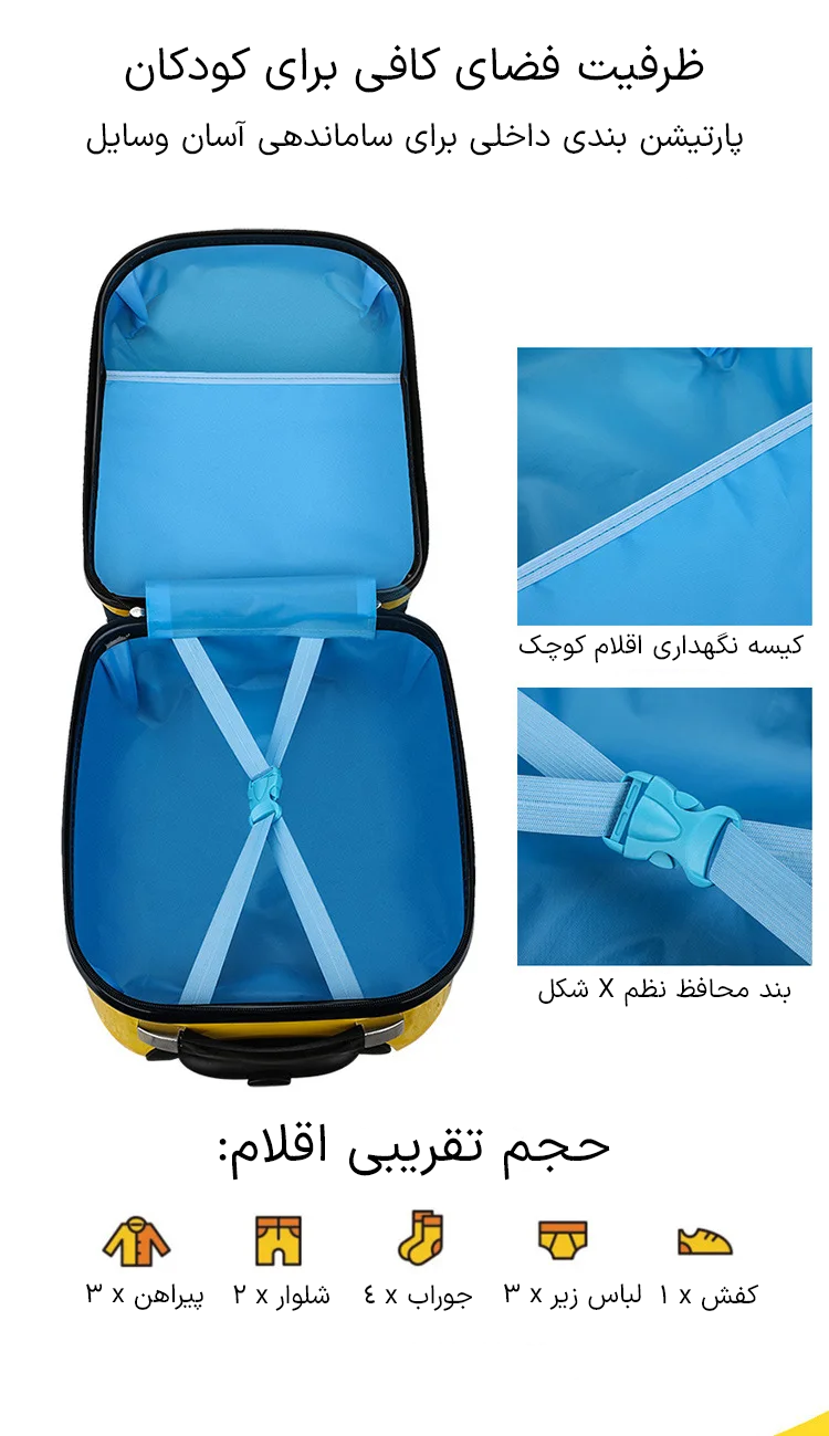 طراحی داخلی این چمدان با اندازه و جیبهای متناسب با لوازم کودکان، جایی امن و مرتب برای نگهداری اسباببازیها، لباسها و لوازم شخصی فراهم میکند.