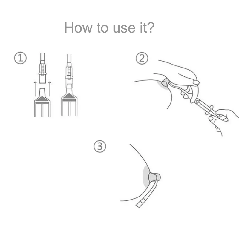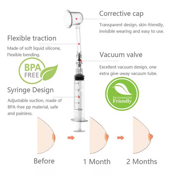 این قالب شفاف را با یک دست بر روی نوک سینه نگه داشته و هوا را با استفاده از یک سرنگ 5 میلی لیتری خارج می کنید تا بتوانید نوک سینه را درون آن مکش کنید. کاربر کنترل مکش را در دست دارد و می تواند نوک سینه را به همان اندازه دلخواه که احساس راحتی میکند بکشد. هنگامی که نوک پستان کشیده شد کاربر پس از جدا کردن دقیق سرنگ از شیر می تواند به فعالیت های عادی خود ادامه داده و نیپلت را به طور محتاطانه درون سوتین بپوشد.