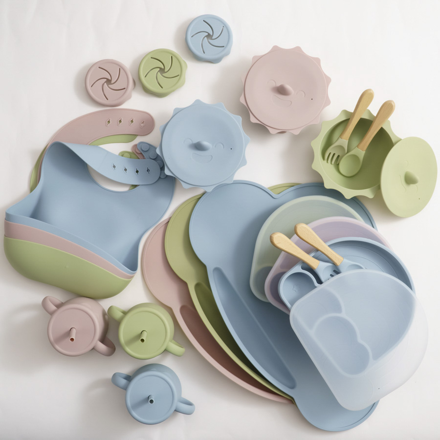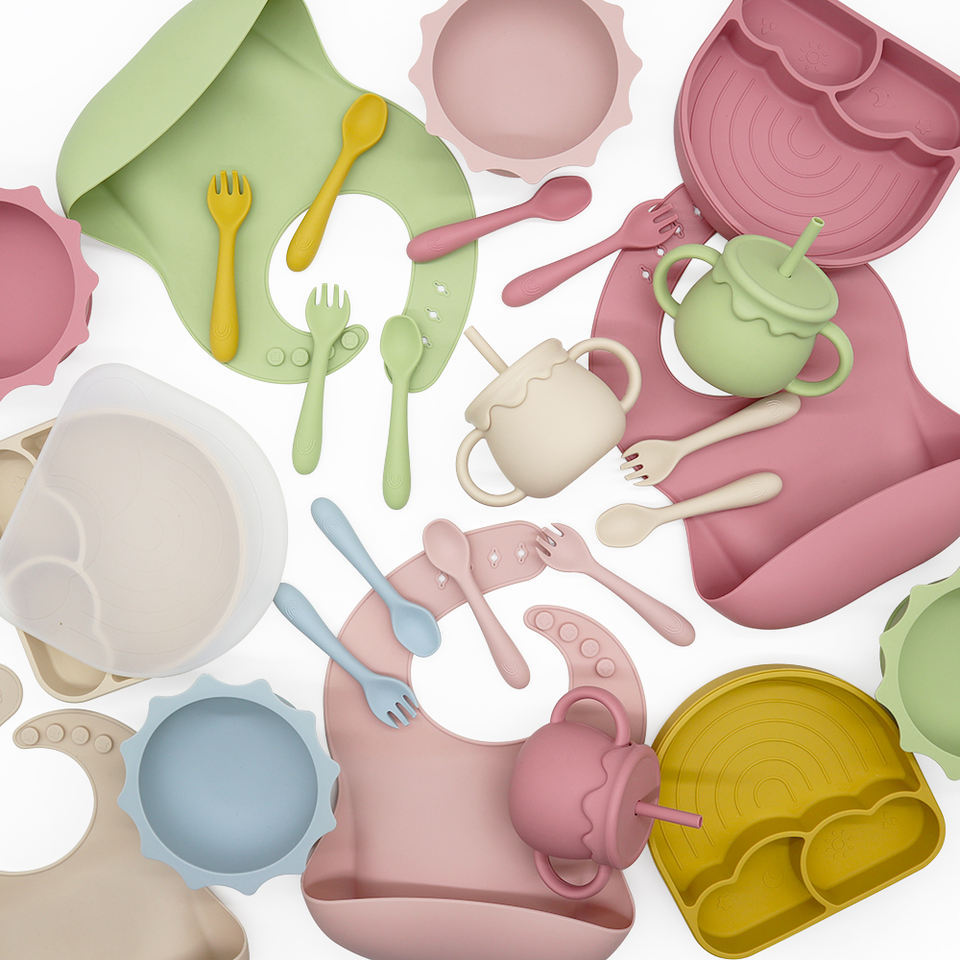 کاسه کودک ,بشقاب سه تکه ضد لغزش ,چنگال سیلیکونی نرم و منعطف ,قاشق سیلیکونی نرم و منعطف ,لید بشقاب ,لید کاسه ,لیوان و ظرف تنقلات خوری سه کاره ,مت زیرانداز |
