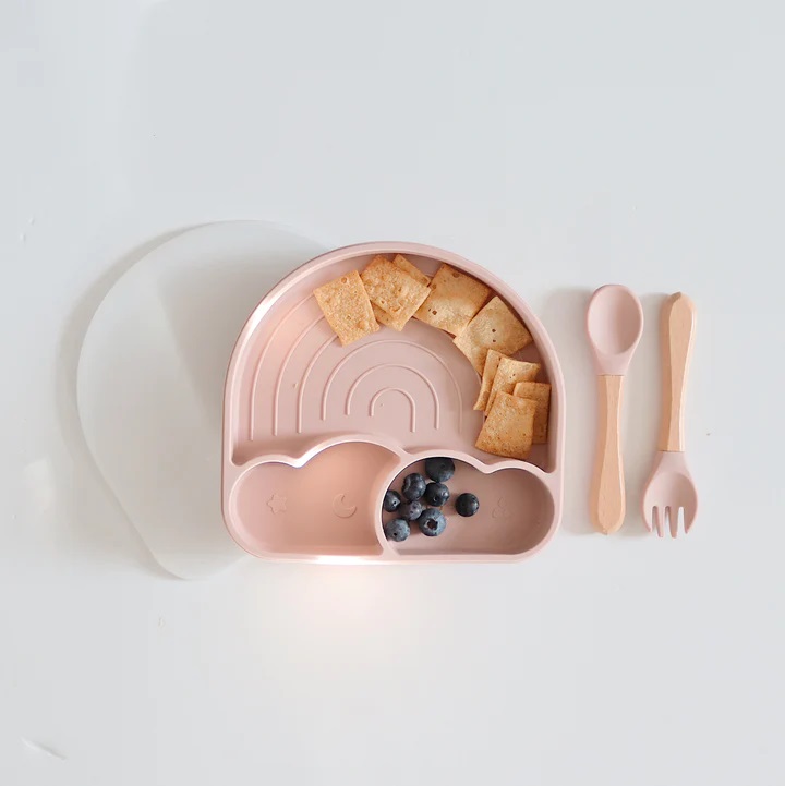 - بشقاب تقسیم شده ضد لغزش: بشقاب سه تکهی این محصول با طرح ابر و رنگینکمان فضای مناسبی را برای غذای کودک شما فراهم میکند. همچنین خاصیت ضد لغزش بودن این محصول باعث میشود که شما بتوانید با خیال راحت و بدون نگرانی از اینکه کودک غذا را روی خودش بریزد و یا ظرف را بردارد، آن را جلوی دلبندتان قرار بدهید.